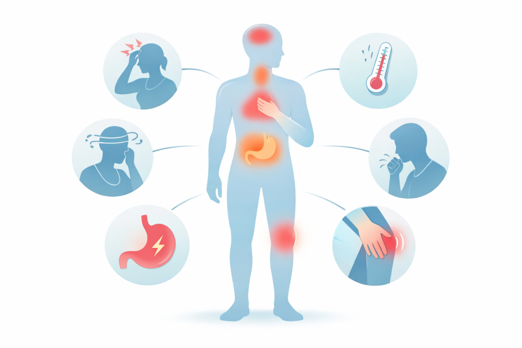 This section explains common health conditions and body symptoms in clear, everyday language. You will find simple explanations of why symptoms happen, what they may mean, and when they might need medical attention. The goal is not to replace a doctor’s visit, but to help you better understand your body and recognize warning signs early. Topics include breathing problems, pain conditions, digestive issues, fever, allergies, and other frequently experienced health concerns.